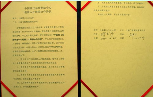 会议期间,清华大学、上海交通大学、北京航空航天大学、西北工业大学、南京航空航天大学、上海大学、四川航天职业技术学院、上海行健职业技术学院和我校同时被列为中国商飞总装制造中心创新人才培养合作伙伴单位。何亚飞院长代表学校与上海飞机制造有限公司人力资源部钟庆部长签署了《中国商飞总装制造中心创新人才培养合作协议书》。中国商用飞机有限责任公司副总经理兼上海飞机制造有限公司总经理贺东风、总经理助理燕桦和各高校领导见证了签约仪式。