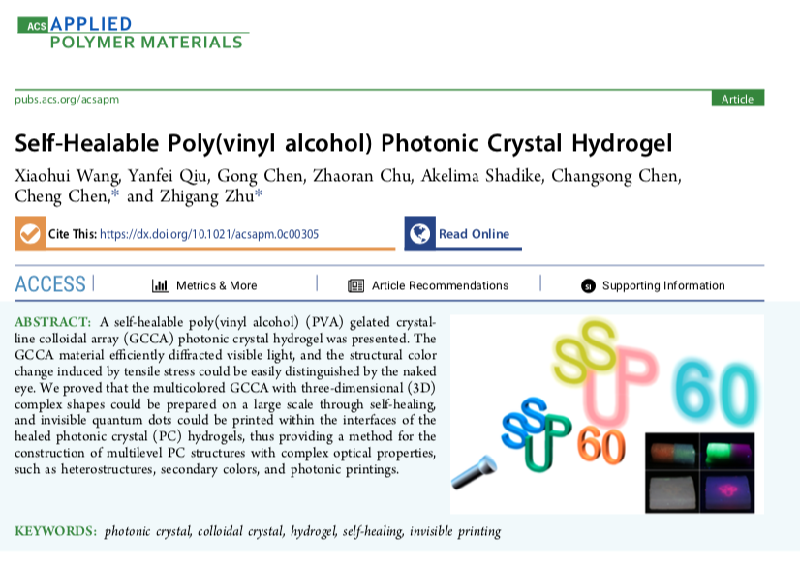 近日,工学部陈诚副教授带领学生在自修复光子晶体水凝胶的研究方面取得新进展,于2020年4月在美国化学会旗下《ACS Applied PolymerMaterials》杂志发表了题为“Self-healablePoly(vinyl alcohol) Photonic Crystal Hydrogel ”的学术文章。