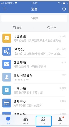 1.点击手机或平板电脑上的企业微信APP。进入后,点击首页底部“工作台”。