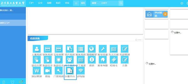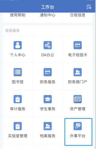3.在个人门户首页的“信息系统”标签区域,点击“外事平台”。