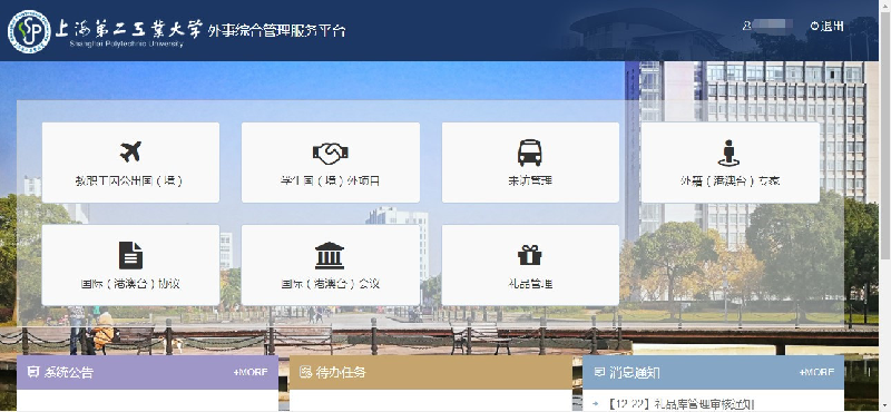 为提高学校外事工作的信息化管理水平,方便广大师生办理业务,国际交流处(港澳台办)设计开发了学校外事综合管理服务平台(简称“外事平台”)。目前外事平台包括教职工因公出国(境)、学生国(境)外项目、来访管理、外籍(港澳台)专家、国际(港澳台)会议、国际(港澳台)协议等6个模块,并在陆续开发礼品管理等其它拓展模块。