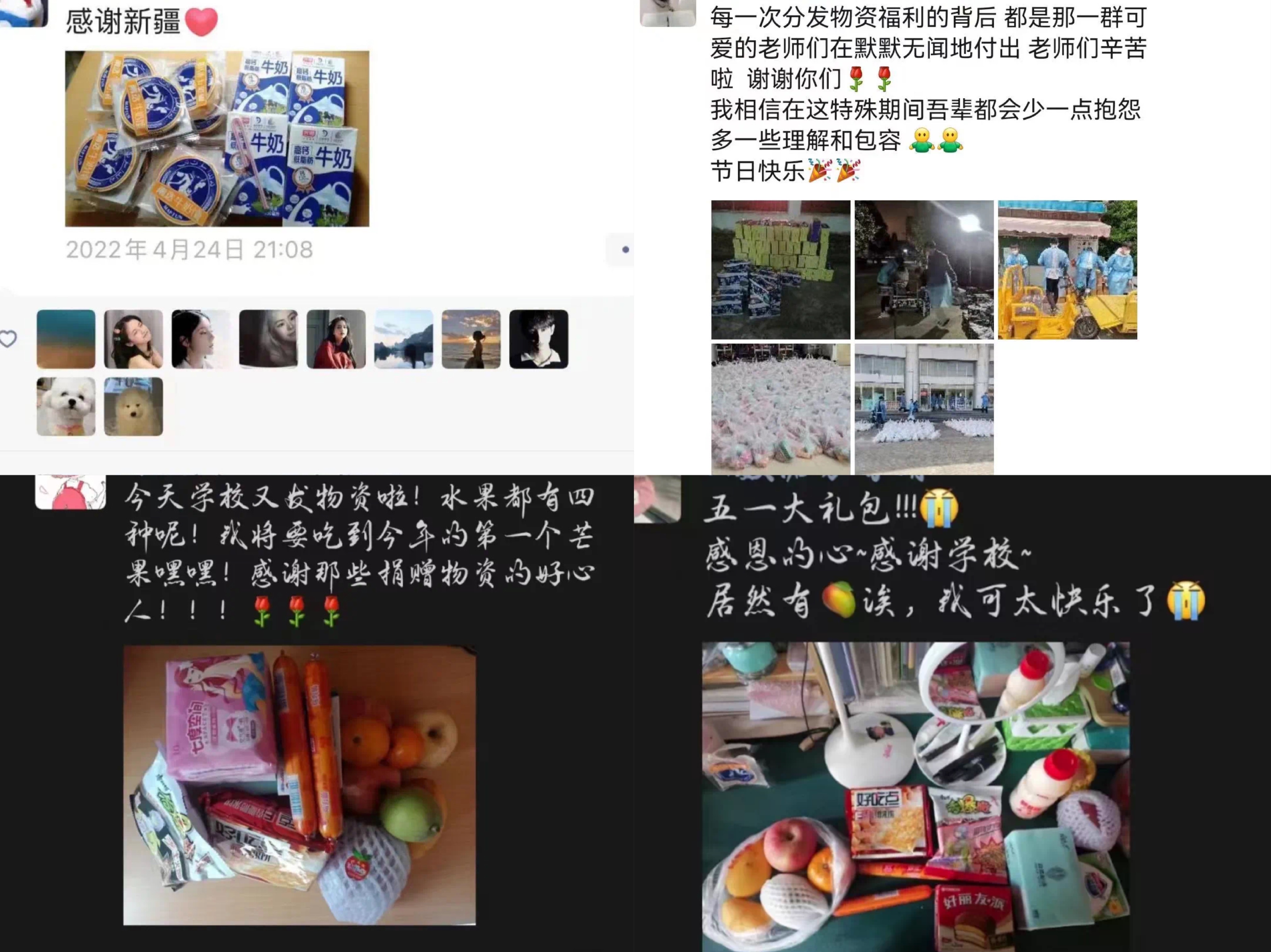 来自捐赠单位和爱心人士的“投喂”与关怀,精准送达同学们的手中。5月1日,在校的50多名教职工志愿者,多部门协同作战,用时5个多小时,为学生装配4000份捐赠物资大礼包,“花式宠爱”在校学生,开展暖心服务。拿到一批又一批爱心物资,同学们收获的不止感动,还有力量。“感谢那些捐赠物资的好心人!”“发自内心的温暖!”感恩的话语,道不尽心中的感动与感激!