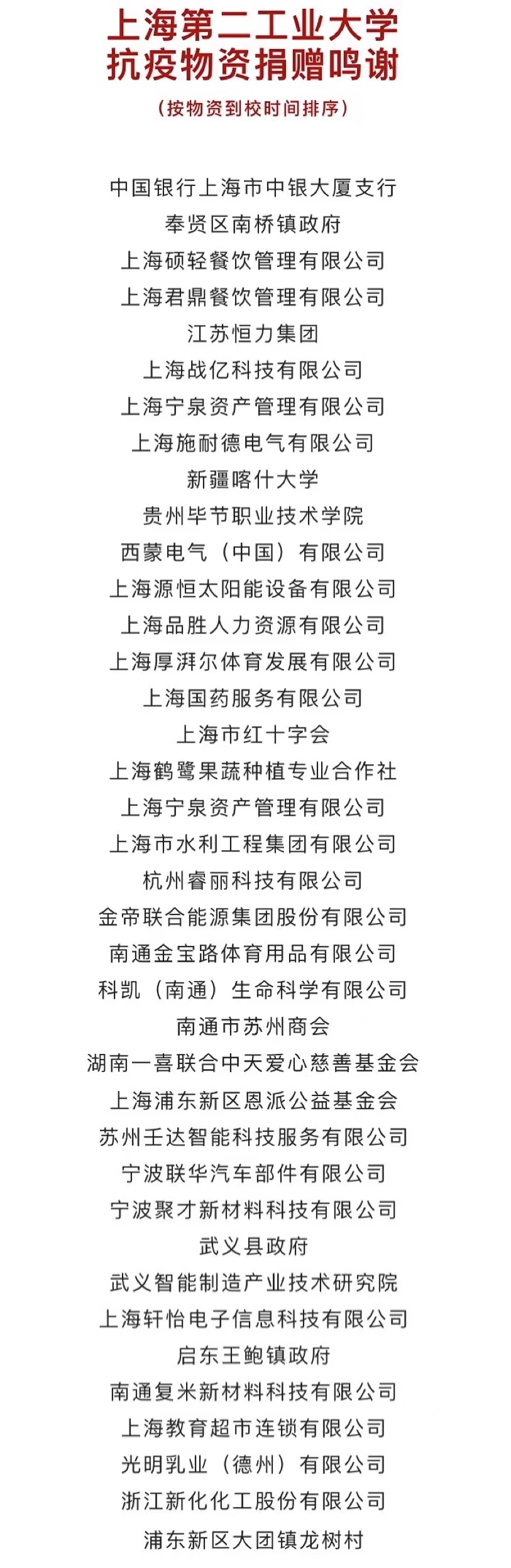 爱心企业,勇担社会责任。江苏恒力集团、上海战亿科技有限公司、西蒙电气(中国)有限公司等20余家企业,迅速启动驰援模式,确定捐赠物资、落实货源和物流,克服运力紧张等困难,捐赠N95口罩、战亿金属离子口罩、防护服、隔离衣、新冠抗原检测试剂、医用隔离面罩、医用检查手套、免洗消毒凝胶、消毒液等防疫物品,胡萝卜、莴笋、苹果、玉瓜等果蔬,以及方便面、饮用水等生活物资,为我校送来爱心与温暖。
