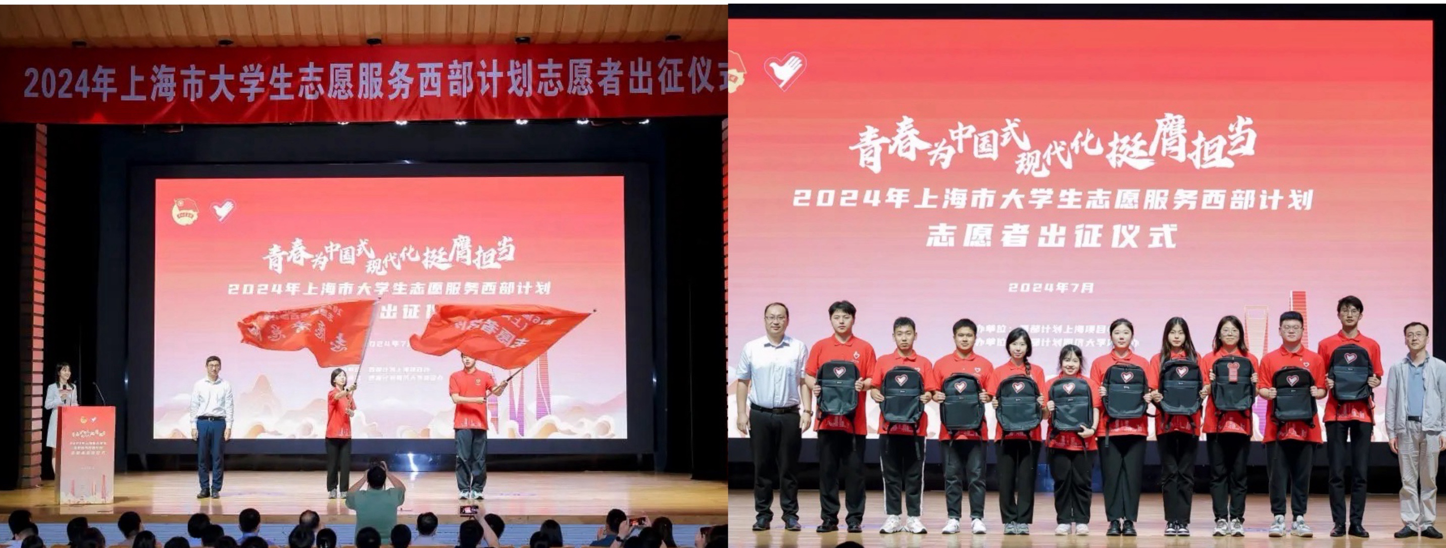 仪式上,杜超男同学作为2024年上海市大学生志愿服务西部计划志愿者代表接受授旗;管晨同学作为西部计划志愿者代表接受出行装备。