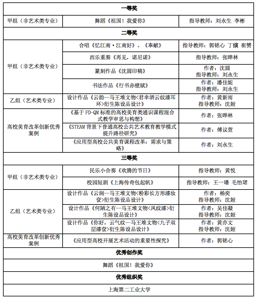 近日,由上海市教育委员会主办的全国第七届大学生艺术展演上海市活动公布了获奖名单。我校师生在本次活动中共获17个奖项,其中一等奖1项、二等奖8项、三等奖6项、优秀创作奖1项,并再度荣获“高校优秀组织奖”。自本届大艺展启动以来,艺术教育中心高度重视,组织我校艺术团及全校师生积极备赛,邀请著名作曲家、编导助力我校报送作品的创作和指导,不仅完成了艺术表演类节目满额参赛,作品质量和艺术内涵也比往届有所提升。其中群舞《祖国!我爱你》以较高的艺术表现和立意同时斩获舞蹈类节目一等奖和优秀创作奖,实现了我校参加大艺展艺术表演类比赛在这两类奖项上零的突破。